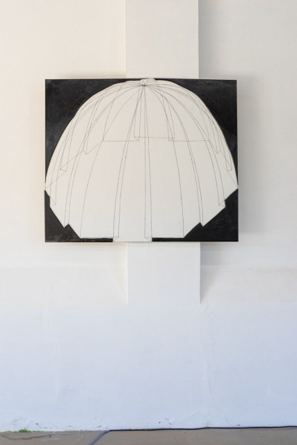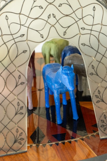 Jakob Lechner hingegen lässt seine wächsernen und betonierten, bunten Pferde im Kreis laufen. In seinem Kompasskarussell drehen sie sich ewig um die eigene Achse, fühlen die richtige Himmelsrichtung und können einfach nicht ausbrechen aus ihrem wunderschönen Käfig. Anders als seine Elefantenherde, die sich scheinbar ungestüm vergnügt, aber womöglich auch in einem Wildtierpark auf den nächsten Safaribus wartet. Ein kleiner roter Ferrari aus Miniaturziegeln hofft vergebens auf die nächste Ausfahrt. Mitten im Raum schwebt ein Gedicht in der Arbeit triforce: sky bird cage fly courage carousel turn decide child try play cry.
