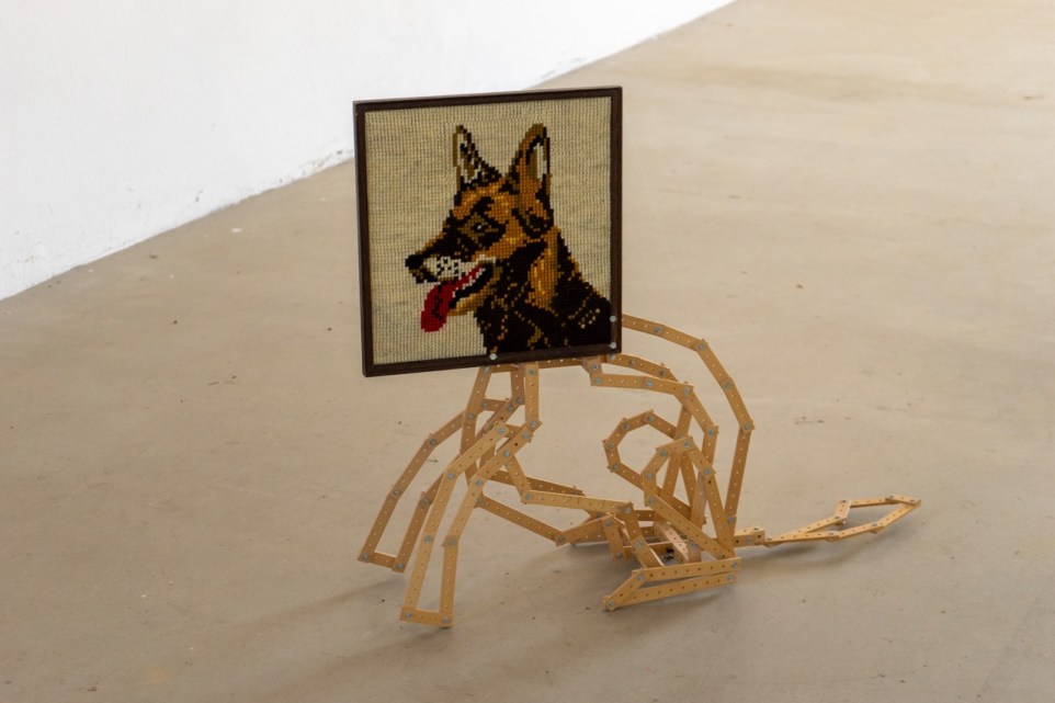 Neben den 300 Pferden gibt es auch Timmi, den Hund. Die Skulptur von Alfred Lenz ist ein analoger Cyborghund, zusammengestellt aus dem Stickbildportrait eines Hundes und der Holzkonstruktion des Hundekörpers. Brav schaut er immer gleich lieb drein, kann sich nur bewegen, wenn der Mensch das möchte.